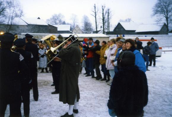 A brass band playing at the opening of the border in the divided village of Mödlareuth (