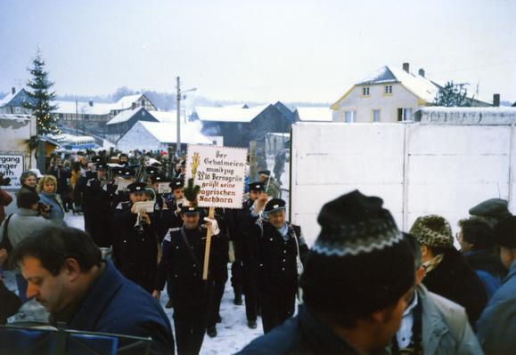 "Mödlareuth border opening. The advent of East German neighbors through the gate of freedom to the West."