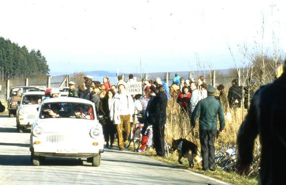 Freude, Grenzschild, Grenzzaun, Grenzöffnung, Hund, Innerdeutsche Grenze, Mehrere Personen, Polizist (BRD), Trabant (Pkw)