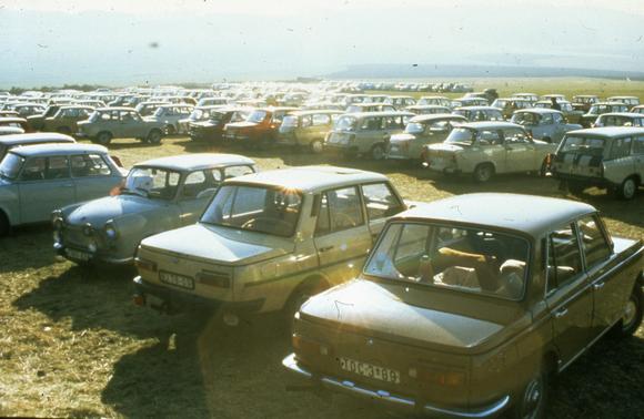 "Carpark near Gumpertsreuth. Temporary carparks were arranged on open fields just beyond the border in order to keep the "flood of Trabbies" out of the city area."