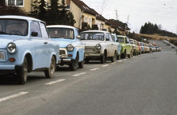 "Looking for parking spaces in suburban streets. Due to the increase in traffic volume the city of Hof experienced an acute lack of parking space. GDR citizens look for parking space in suburban streets. On many days the streets are full of parked cars."