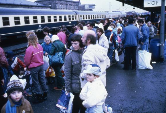 "Der Hofer Hauptbahnhof erlebt Massenanstürme wie noch nie. In den einfahrenden und abfahrenden Zügen herrscht dichtes Gedränge. Zugfolgen von 20 Minuten sind nötig, um die wartenden Massen zu befördern. Einzelne Züge befördern bis zu 5000 Personen."