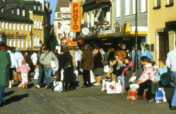 "Ruhepause in der Fußgängerzone. Viele DDR-Bürger sind bis zu 20 Stunden unterwegs, um ihr Begrüßungsgeld in Empfang zu nehmen und Einkäufe zu tätigen. Auch Kleinkinder werden diesen Strapazen unterworfen, weil sie "bares Geld" bedeuten."