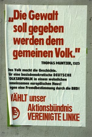 "Die Gewalt soll gegeben werden dem gemeinen Volk." ("The power should be given to the common folk.") Thomas Müntzer, 1525. A wall with an election poster for the electoral alliance Vereinigte Linke (United Left)