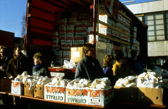 "Fliegende Händler vor der Freiheitshalle. An vielen Plätzen im Stadtgebiet bieten Fliegende Händler aus dem ganzen Bundesgebiet begehrte Waren (z.B. Südfrüchte, Textilien, Elektronikartikel etc.) an und erzielen enorme Gewinne."