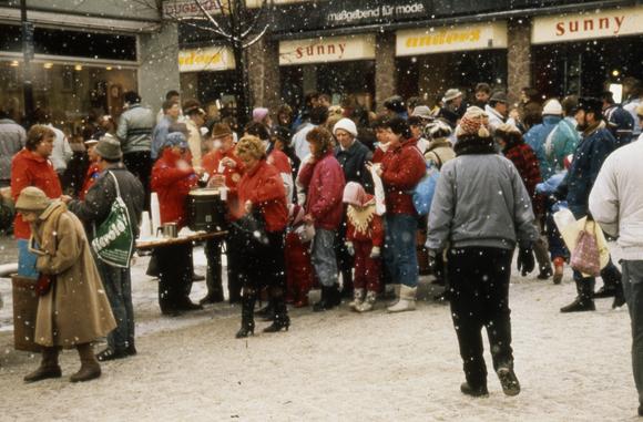 "Hilfsorganisationen versorgen DDR-Besucher. Hilfsorganisationen versorgen in der Innensatdt vor allem bei schlechtem Wetter die DDR-Besucher. Auch kostenlose Übernachtungsmöglichkeiten für DDR-Bürger werden in öffentlichen Gebäuden der Stadt oder von Hilfsbereiten Privatpersonen ermöglicht."