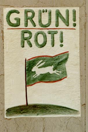 Offsetlithographie (81 x 57,4 cm) mit Hasenfahne, Teil der Aktionen des Grafikers Manfred Butzmann, der auf der Mitgliederversammlung des Verbandes Bildender Künstler der DDR des Bezirks Berlin am 16. November 1989 dafür plädierte, die Ostseite der Berliner Mauer zu bemalen (Eugen Blume (Hg.): Butzmanns Heimatkunde in 24 Abteilungen, Berlin 1992, S.110-114)