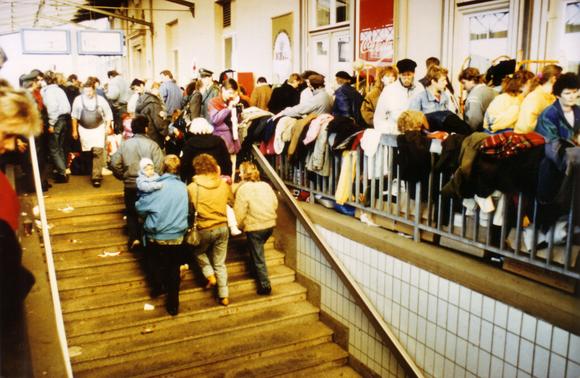 Thousands of East German refugees travelled with special East German Railway trains, arriving in the West German town of Hof in October 1989. After fleeing to the German Embassy in Prague, many of the people had been there since August until finally granted permission to leave the country on 30 September.