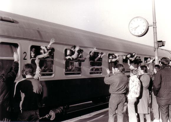 Thousands of East German refugees travelled with special East German Railway trains, arriving in the West German town of Hof in October 1989. After fleeing to the German Embassy in Prague, many of the people had been there since August until finally granted permission to leave the country on 30 September.