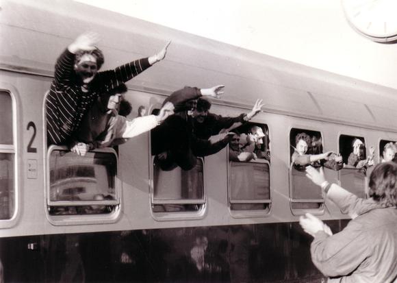 Thousands of East German refugees travelled with special East German Railway trains, arriving in the West German town of Hof in October 1989. After fleeing to the German Embassy in Prague, many of the people had been there since August until finally granted permission to leave the country on 30 September.