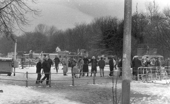 Absperrgitter, Kinderwagen, Mehrere Personen, Mülltonne, Schnee, Übertragungswagen