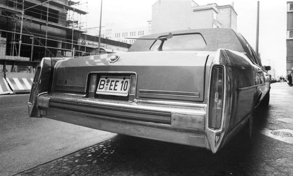"Frühjahr 1990, die ersten Investoren erscheinen mit großen Schlitten inklusive Bumerang-Antenne. Hier in der Friedrichstraße/Ecke Kochstraße. Kamera: Praktica VLC 3 mit Carl Zeiss Jena Flektogon 2,8/20 MC electric"