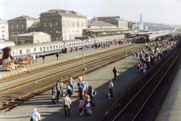 Thousands of East German refugees travelled with special East German Railway trains, arriving in the West German town of Hof in October 1989. After fleeing to the German Embassy in Prague, many of the people had been there since August until finally granted permission to leave the country on 30 September.