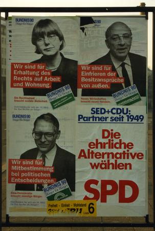 "Die ehrliche Alternative wählen" ("Vote for the honest alternative"). A metal frame with election posters for Bündnis 90 (Alliance 90, consisting of the citizen's movements: Neues Forum, Demokratie Jetzt and der Initiative Frieden und Menschenrechte) and the SPD