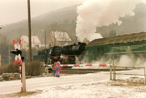 "Erhöhter Reisezugbedarf nach Westen wird auch mit Dampfloks bewältigt, Plaue in Thüringen im Dezember 1989"