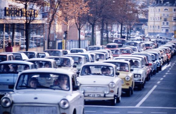 "Ernst-Reuter-Straße in Hof, Hauptdurchgangsstraße, ab 10.11.1989 sah es viele Wochen so aus (Auszahlung des Begrüßungsgeldes)"