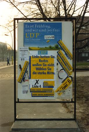 Metal frame with election posters for the LDP (Liberal-Demokratische Partei Deutschlands (Liberal Democratic Party of Germany)) and SPD (Sozialdemokratische Partei Deutschlands (Social Democratic Party of Germany))