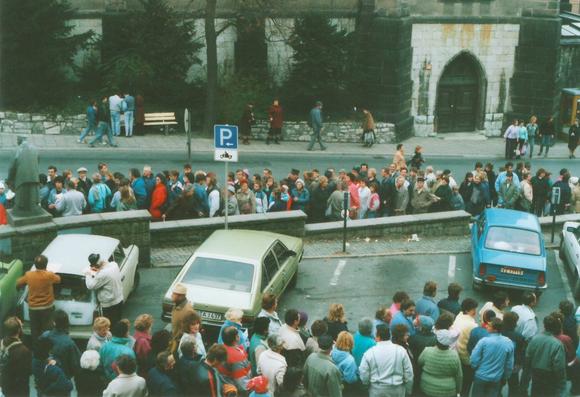 "Hof/Sonnenplatz mit Blick zur Altstadt. Die Szene wiederholte sich ab dem 10.11.89 täglich und zeigt die Menschen, die an der dort befindlichen Sparkassenzentrale zum Empfang des Begrüßungsgeldes anstanden."