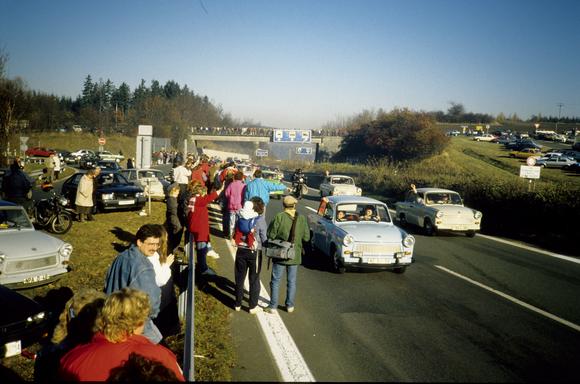 Greeting GDR citizens on the A 9 freeway near the Rudolphstein/Hirschberg border crossing, that was opened on 9 November 1989