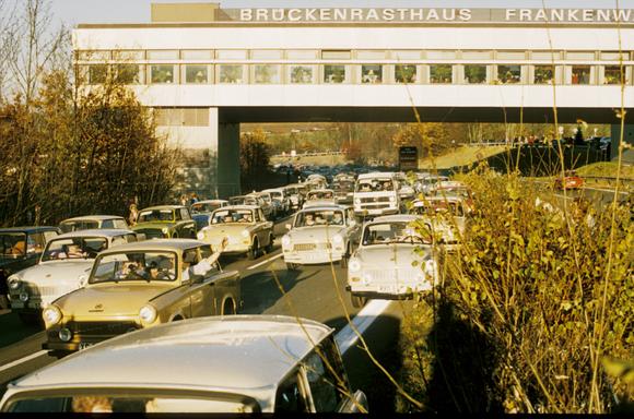 Verkehrsstau auf der Autobahn A 9 in der Nähe des Grenzübergangs Rudolphstein/Hirschberg, der am 9. November 1989 geöffnet wurde
