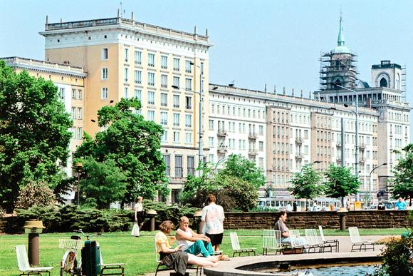 "Der Zentrale Platz als städtebauliche Ost-West-Achse und weitläufige Wiese in der Stadt. Vom Springbrunnen hatte man 1990 noch einen freien Blick über den Breiten Weg hinweg bis durch zu den Türmen der Johanniskirche." (aus: Stadt im Wandel. Magdeburg zwischen 1990 und 2006, in vergleichenden Fotografien von Werner Klapper, 2. Aufl., Magdeburg: Ost-Nordost Verlag 2007)