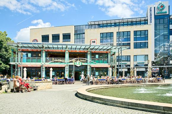 "Starting in November 1996, the Ulrichhaus building is erected on the West side of the Breiter Weg. In only 15 months, 18,000 square meters of usable floor space were created, half of which for retailers. The house was opened in March 1998, requiring the fountain to be moved westwards." (from: Stadt im Wandel. Magdeburg zwischen 1990 und 2006, in vergleichenden Fotografien von Werner Klapper, 2. Aufl., Magdeburg: Ost-Nordost Verlag 2007)