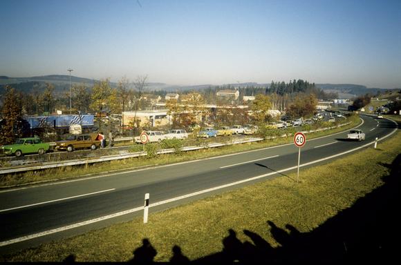 Stau auf der Autobahn A 9 in der Nähe des Grenzübergangs Rudolphstein/Hirschberg, der am 9. November 1989 geöffnet wurde
