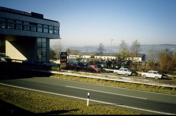 Autos auf der Autobahn A 9 am Brückenrasthaus Frankenwald in der Nähe der ehemaligen innerdeutschen Grenze in Bayern, im Hintergrund eine Warteschlange vor einer Filiale der Post, siehe auch