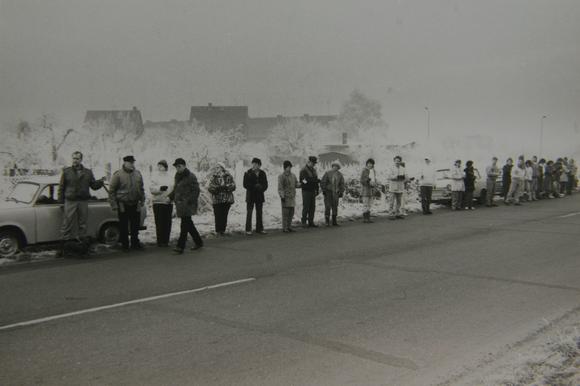 Menschenkette an der B5 bei Perleberg, als Teil einer Menschenkette durch die ganze DDR, an der am 3. Dezember 1989 hunderttausende Bürger partizipierten