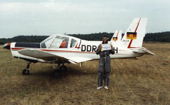 "Viola Holzmann, stolz nach ihrem ersten Soloflug. Die Z42 im Hintergrund ist die DDR-WOH, die baugleiche Maschine auf der ich meinen ersten Soloflug bestanden hatte. Die Kabine ist mit einer Plane verhängt, die per Druckknöpfen an der Kanzel befestigt wurde. Hier wird Instrumentenflug trainiert."