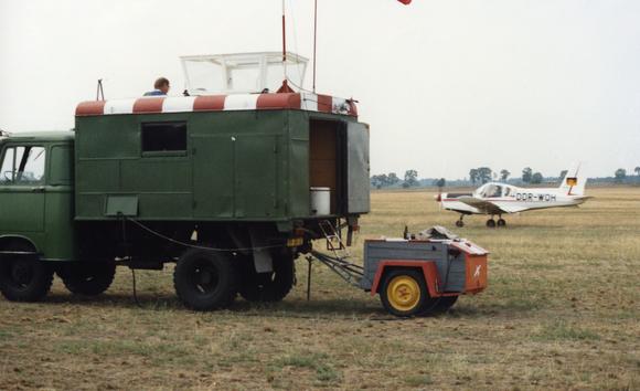 "Am SKP, dem Startkontrollpunkt. Einen Tower oder eine Flugleitung gab es 1990 noch nicht in Schönhagen. Der SKP stand an der 'Schwelle' der Start- und Landerichtung und von dort wurden per Funk die Freigaben erteilt und die Bewegungen koordiniert."