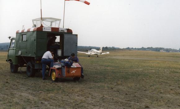 "Am SKP, dem Startkontrollpunkt. Einen Tower oder eine Flugleitung gab es 1990 noch nicht in Schönhagen. Der SKP stand an der 'Schwelle' der Start- und Landerichtung und von dort wurden per Funk die Freigaben erteilt und die Bewegungen koordiniert."