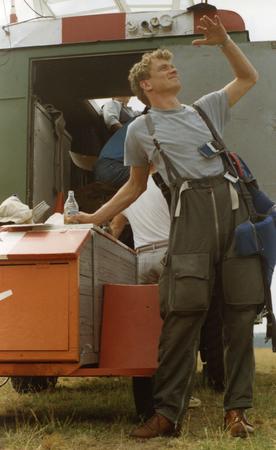 "...mit Fallschirm und Kanalhose (der Luftwaffe) beim Faxen machen am SKP, dem Startkontrollpunkt. Einen Tower oder eine Flugleitung gab es 1990 noch nicht in Schönhagen. Der SKP stand an der 'Schwelle' der Start- und Landerichtung und von dort wurden per Funk die Freigaben erteilt und die Bewegungen koordiniert."