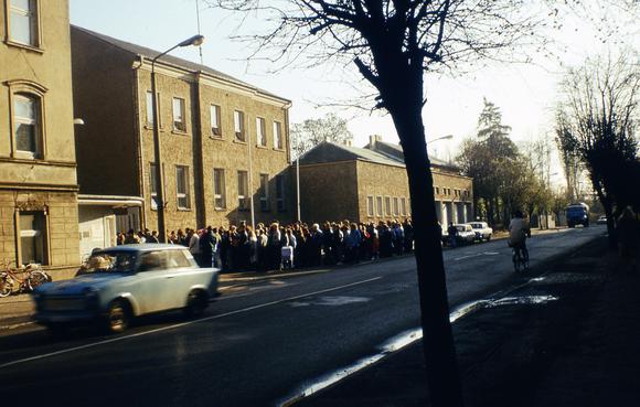 "Am 10. November 1989 stehen über 100 Personen zwecks Visa-Bantragung vor der Kreis-Volkspolizei-Dienststelle in Bernau, Weißenseer Straße an.","On 10 November 1989 more than 100 people wait in line for the purpose of applying for visas, outside the district People's Police station in Bernau, on Weißenseer Straße."