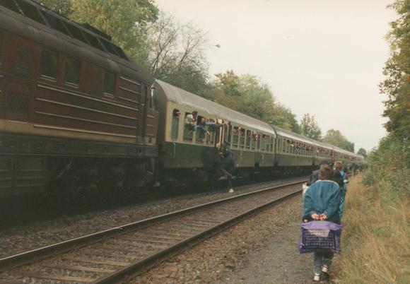"Train with refugees from Prague on 1 October 1989. The first stop was in the West, in Feilitzsch, before the train continued to Hof. Feilitzsch citizens greeted the refugees and many gave them fruit, beverages etc., even toys were distributed to children travelling in the train. My son gave a number of plush toys to the children."