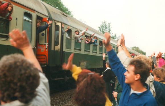 "Train with refugees from Prague on 1 October 1989. The first stop was in the West, in Feilitzsch, before the train continued to Hof. Feilitzsch citizens greeted the refugees and many gave them fruit, beverages etc., even toys were distributed to children travelling in the train. My son gave a number of plush toys to the children."