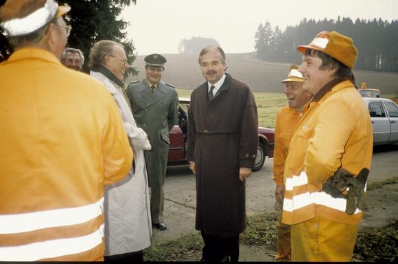 Der damalige Staatssekretär im Bayerischen Staatsministerium des Innern Peter Gauweiler und der damalige Ministerpräsident Bayerns Max Streibl bei den Räumungsarbeiten zur Grenzöffnung an der Autobahn A 722 (A 72)