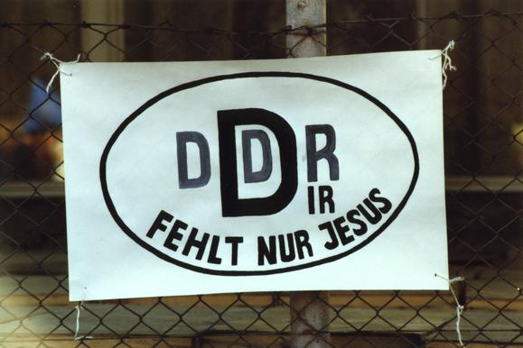 "DDR, dir fehlt nur Jesus" ("GDR, you only lack Jesus") - banner