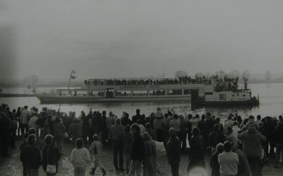 "25.12.1989 - 1st Day of Christmas. Wittenberg is in great, joyous expectation! A ship, namely the 'Lüneburger Heide', is to come with citizens from the neighbouring towns on the border of the river Elbe, across from Lütkenwisch, which resides on the local bank of the river: Schnackenburg, Gartow, Lüchow and Dannenberg." (translated from Horst und Ralf Podiebrad: DDR/D Wittenberge. Band 3, S. 132)