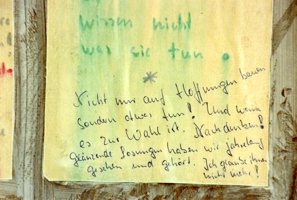 [...] wissen nicht / was sie tun / Nicht nur auf Hoffnungen bauen / sondern etwas tun! Und wenn / es zur Wahl ist. Nachdenken! / Glänzende Lösungen haben wir jahrelang gesehen / und gehört. Ich glaube ihnen / nicht mehr!