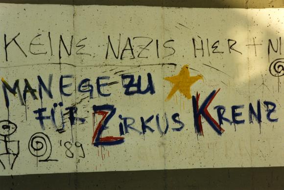 Mauersprüche "Keine Nazis" und "Zirkus Krenz"