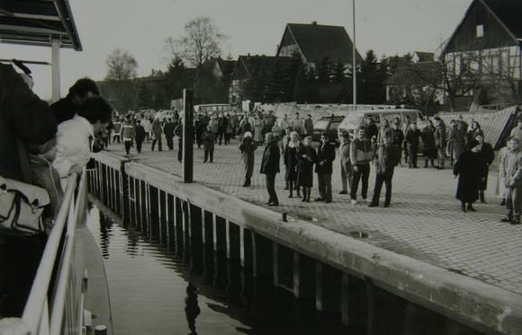 Begrüßungsgeschenk, Blasmusik, Boot, Bürgermeister, Feuerwehr, Freude, Hafen, Innerdeutsche Grenze, Menschenmenge, Weihnachten