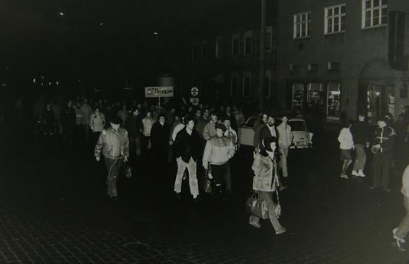 crowd, demonstration, night, protest sign, showcase, Trabant (car)