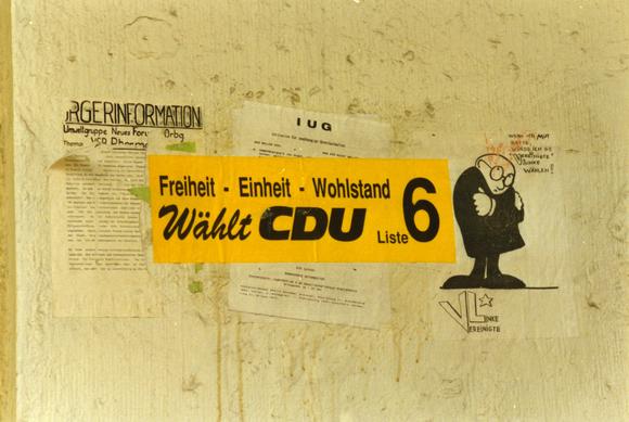 A wall with notices and election posters for the Vereinigten Linken (United Left) and the CDU