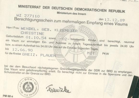Ministerrat der Deutschen Demokratischen Republik / Ministerium des Innern / den 13.12.89 / Berechtigungsschein zum mehrmaligen Empfang eines Visums / Herr / Frau Wendel, geb. Kleemeier / Christine / Geburtsdatum 01.10.54 sowie 2 mitreisende Kinder sind berechtigt, neunmal / ein Visum zur einmaligen Ein- und Ausreise zu einem Tagesaufenthalt bis jeweils 24.00 Uhr / bzw. zu einem Aufenthalt bis 24.00 Uhr des auf die Einreise folgenden Tages / bis 12.06.90 / für die Kreise Greiz, Plauen / bei der dem Besuchsort nächstgelegenen Grenzübergangsstelle der DDR zur BRD zu empfangen. / Das Visum wird gebührenpflichtig erteilt. Es berechtigt nicht zur Einreise in die Sperrzone und den / Schutzstreifen an der Grenze zur BRD. / Franzke