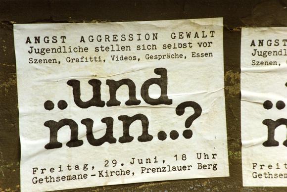 Angst Agression Gewalt / Jugendliche stellen sich selbst vor / Szenen, Grafitti, Videos, Gespräche, Essen / ..und nun..? / Freitag, 29. Juni, 18 Uhr / Gethsemane-Kirche, Prenzlauer Berg