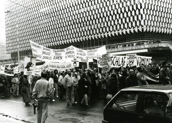 Demonstranten mit Transparenten in der Karl-Liebknecht-Straße am Centrum-Warenhaus Berlin Alexanderplatz mit seiner 2004 abgerissenen Aluminium-Wabenfassade bei der Alexanderplatz-Demonstration, der "größte[n] nicht staatlich gelenkte[n] Demonstration in der Geschichte der DDR" (