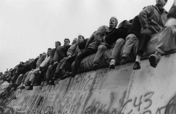 Crowd of people on the Wall at Potsdamer Platz, where the new border crossing was opened on 12 November 1989