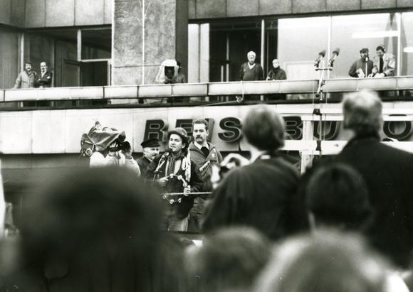 Auftritt des Liedermachers Gerhard Schöne vor dem Haus des Reisens in der Alexanderstraße bei der Alexanderplatz-Demonstration, der "größte[n] nicht staatlich gelenkte[n] Demonstration in der Geschichte der DDR" (