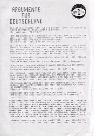 A pamphlet from the "Bürgerinitiative Deutsche Einheit" (BDE) ("Citizens' Initiative for German Unity") an initiative that emerged from the "International Society for Human Rights" (ISHR) which counted many GDR migrants among its members. The BDE was founded in Schleswig in January 1990 in order to support the opposition in the GDR on its path to reunification."